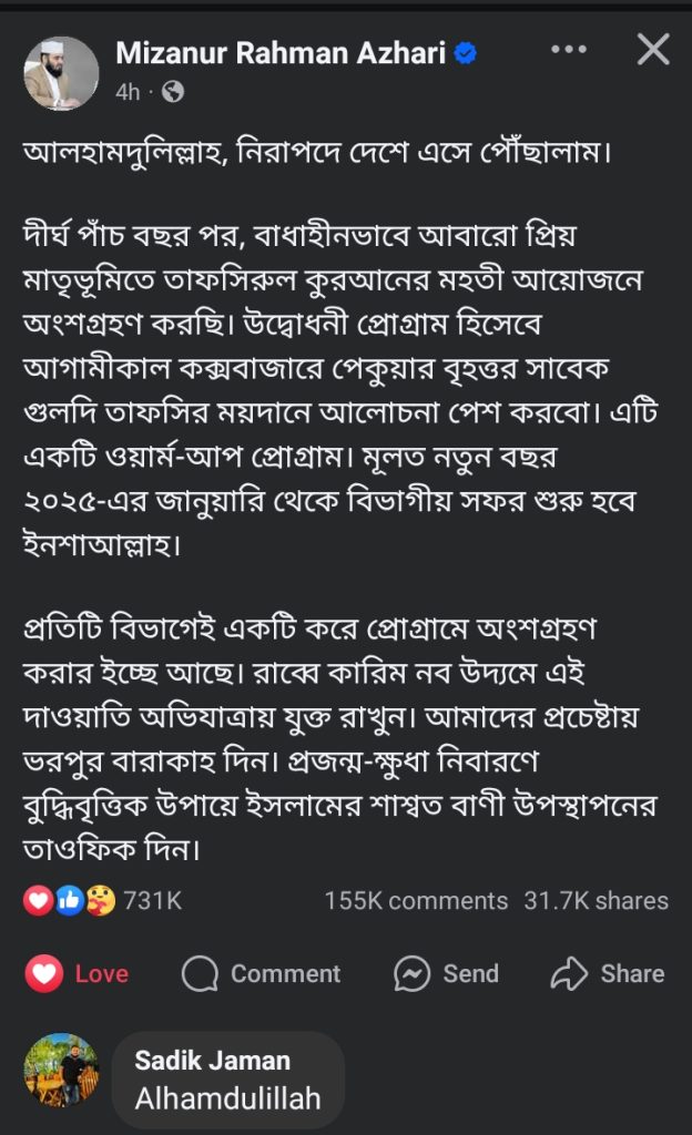 বাংলাদেশের জনপ্রিয় ইসলাম বক্তা বাংলাদেশে পৌছে নিজের ভেরিফাইড রাইস বুক এই স্ট্যাটাস দিয়েছেন।