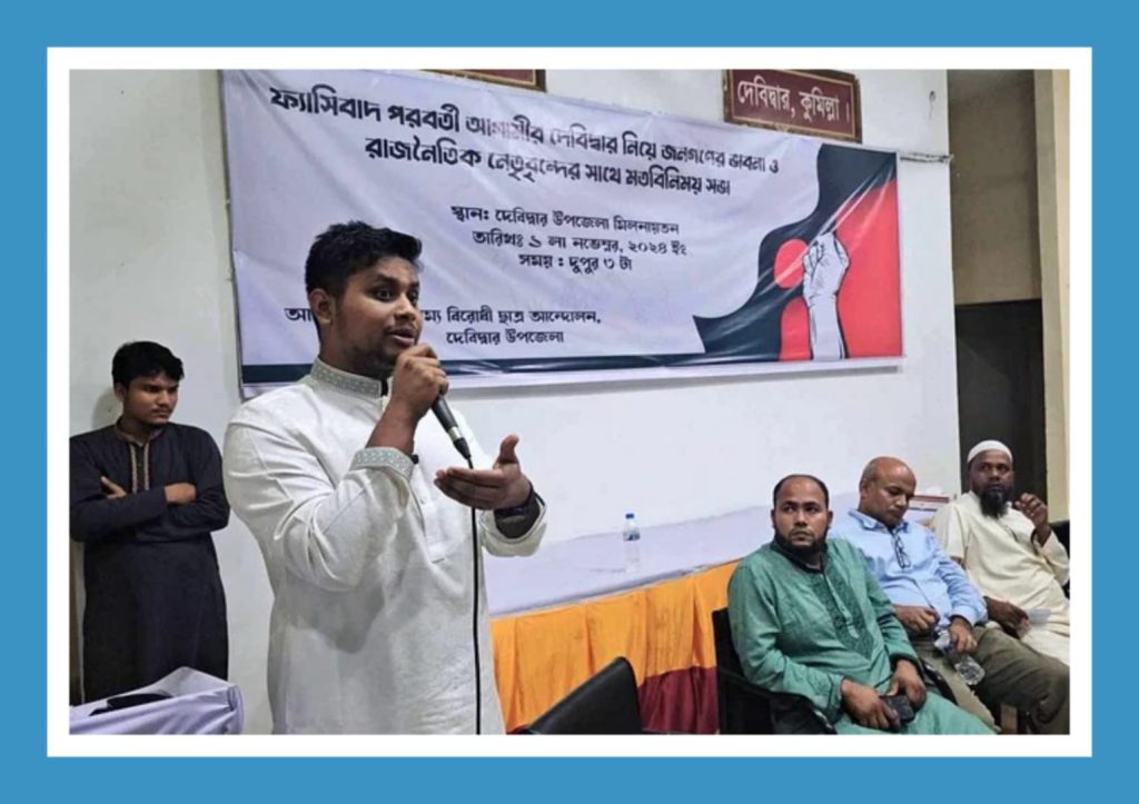 আজ শুক্রবার বিকেলে কুমিল্লার দেবীদ্বার উপজেলা পরিষদ হলরুমে ‘ফ্যাসিবাদ-পরবর্তী আগামীর দেবীদ্বার নিয়ে জনগণের ভাবনা ও রাজনৈতিক নেতৃবৃন্দের সাথে মতবিনিময় সভা’য় হাসনাত আবদুল্লাহ এ কথা বলেন।