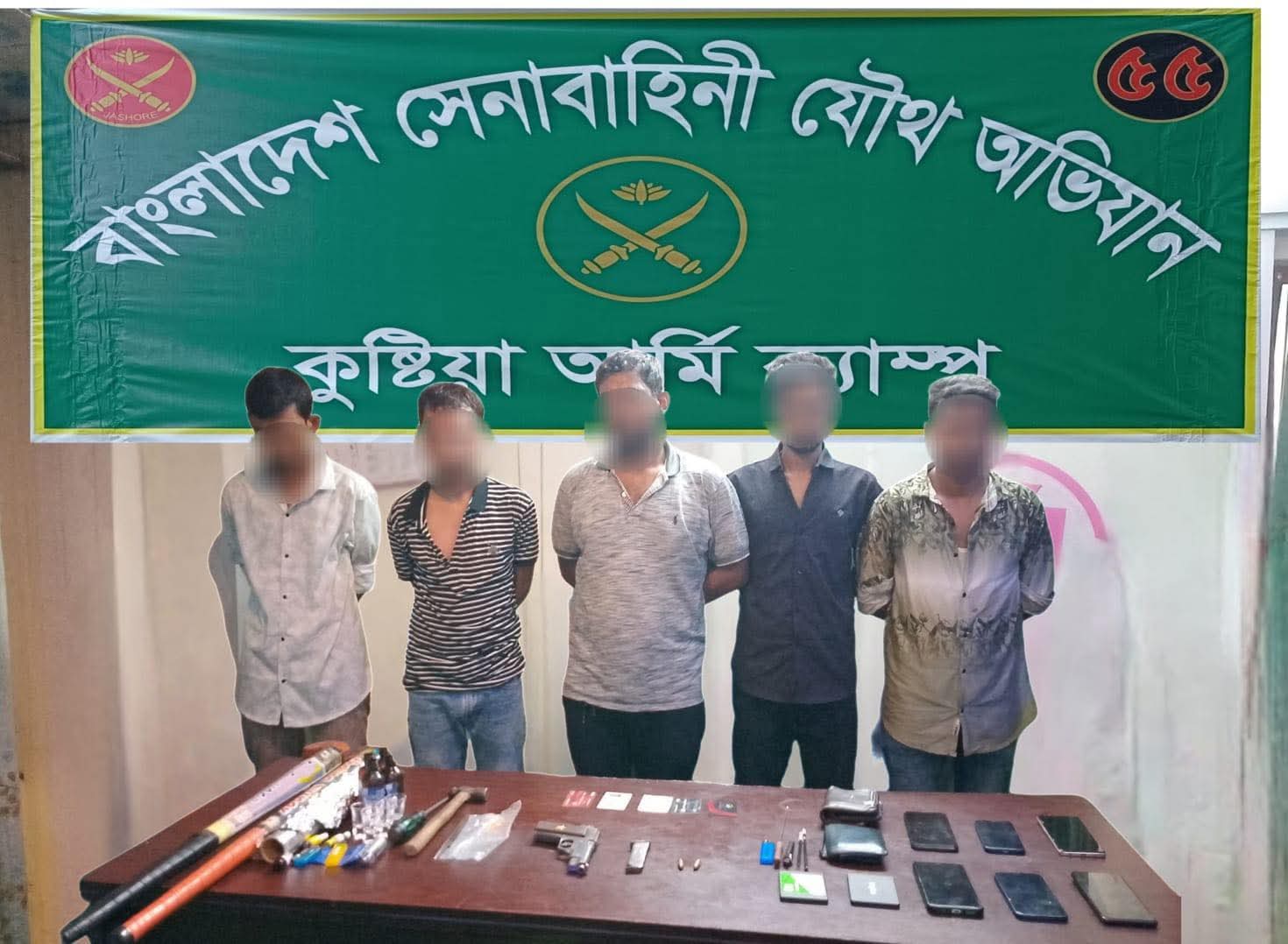 কুষ্টিয়া সদর উপজেলায় যৌথ অভিযানে অস্ত্রসহ ০৫ জন সন্ত্রাসী গ্রেফতারঢাকা, ২৫ জুন ২০২৫ (বুধবার): গত রাত আনুমানিক ৯ টা ৩০ মিনিটে কুষ্টিয়া সদর উপজেলার আইলচারা এলাকায় সুনির্দিষ্ট গোয়েন্দা তথ্যের ভিত্তিতে সেনাবাহিনীর নেতৃত্বে একটি যৌথ অভিযান পরিচালনা করা হয়। অভিযানে ১টি ৯ মিঃমিঃ পিস্তল, ১টি ম্যাগাজিন, ২ রাউন্ড এ্যামোনিশন এবং মাদকদ্রব্য সহ ০৫ জন ব্যক্তিকে গ্রেফতার করা হয়।বাংলাদেশ সেনাবাহিনী সর্বসাধারণের নিরাপত্তা নিশ্চিত করতে বদ্ধপরিকর। যেকোন অপরাধমূলক কর্মকাণ্ডের তথ্য নিকটস্থ সেনা ক্যাম্প অথবা আইন-শৃঙ্খলা বাহিনীর নিকট প্রদান করতে সকলকে অনুরোধ জানানো যাচ্ছে।