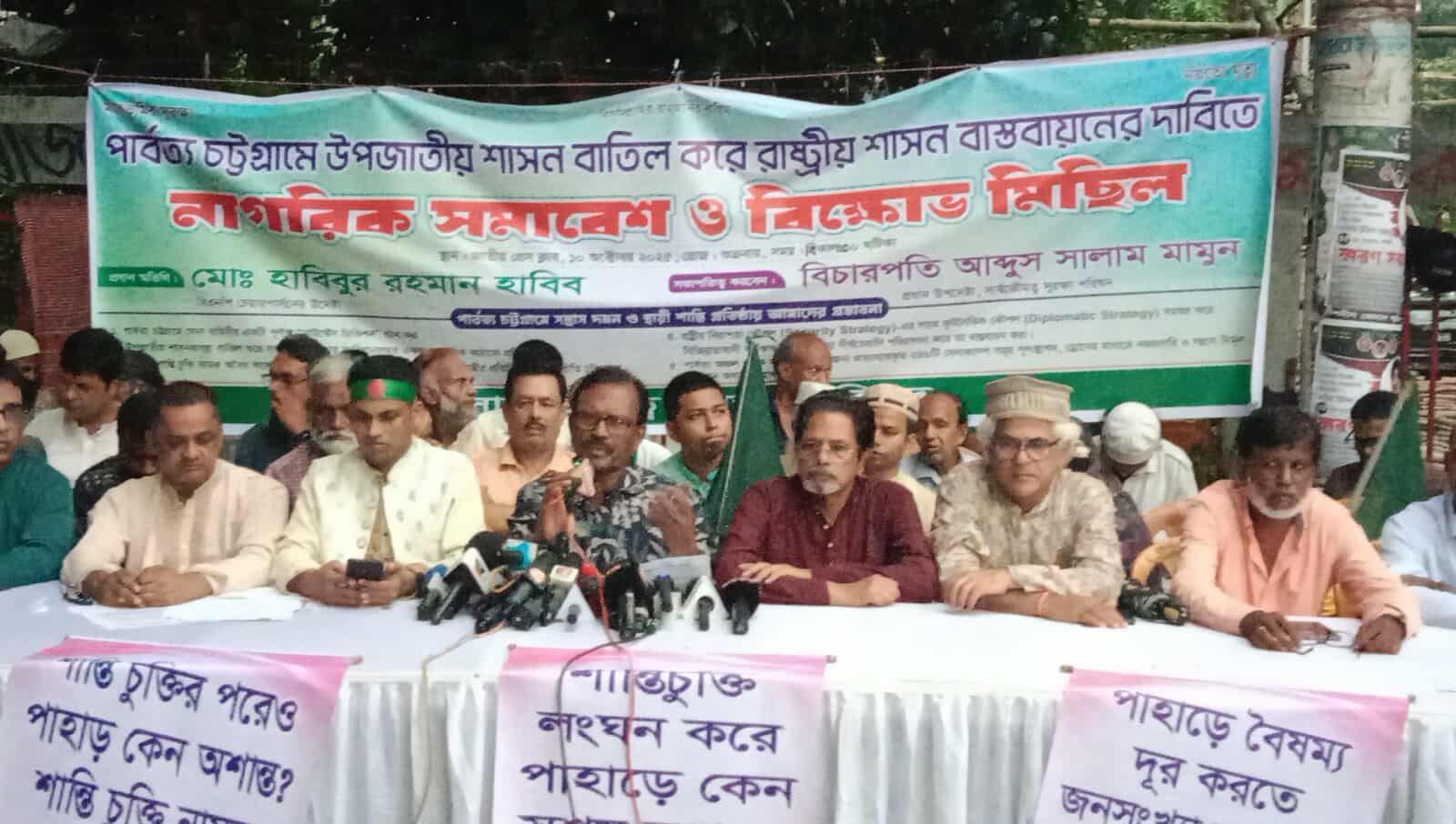 পার্বত্য চট্টগ্রামে রাষ্ট্রীয় সার্বভৌমত্ব রক্ষায় উপজাতীয় শাসনব্যবস্থা বাতিল করে সংবিধানসম্মত একক প্রশাসনিক কাঠামো প্রতিষ্ঠার দাবিতে শুক্রবার (১০ অক্টোবর) বিকাল ৩.০০ ঘটিকায় রাজধানীর জাতীয় প্রেসক্লাবের সামনে আয়োজিত এক নাগরিক সমাবেশে এই দাবি জানানো হয়। সমাবেশে প্রধান অতিথি হিসেবে বক্তব্য রাখেন বিএনপি চেয়ারপার্সনের উপদেষ্টা হাবিবুর রহমান হাবিব। প্রধান আলোচক হিসাবে বক্তব্য রাখেন পার্বত্য নিউজ এর সম্পাদক মেহেদী হাসান পলাশ।