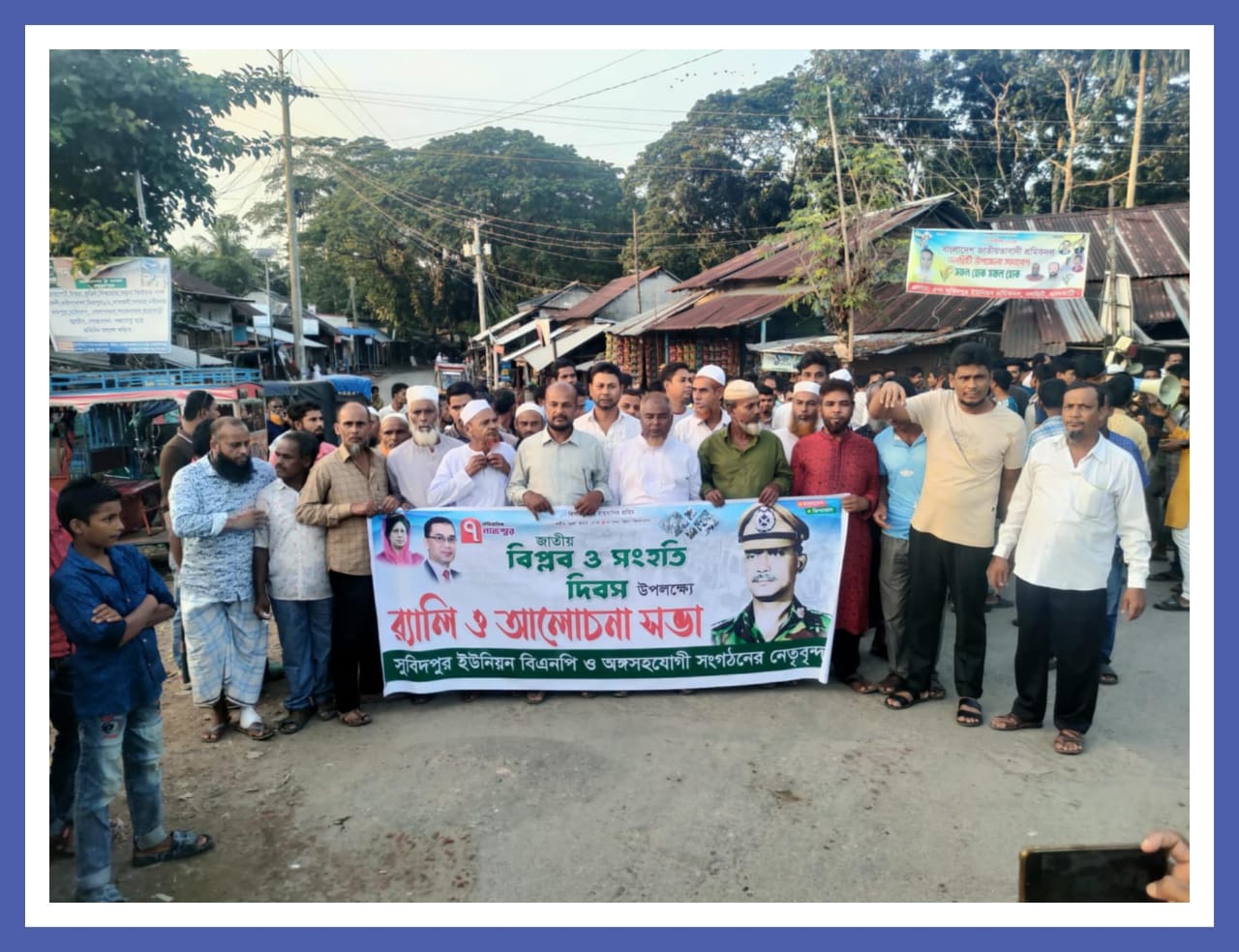 ঐতিহাসিক ৭ নভেম্বর জাতীয় বিপ্লব ও সংহতি দিবস উপলক্ষ্যে র্যালি ও আলোচনা সভা অনুষ্ঠিত হয়েছে, নলছিটি উপজেলার সুবিদপুর ইউনিয়ন বিএনপি ও অঙ্গ সহযোগী সংগঠনের আয়োজনে এই কর্মসূচি পালিত হয়।
