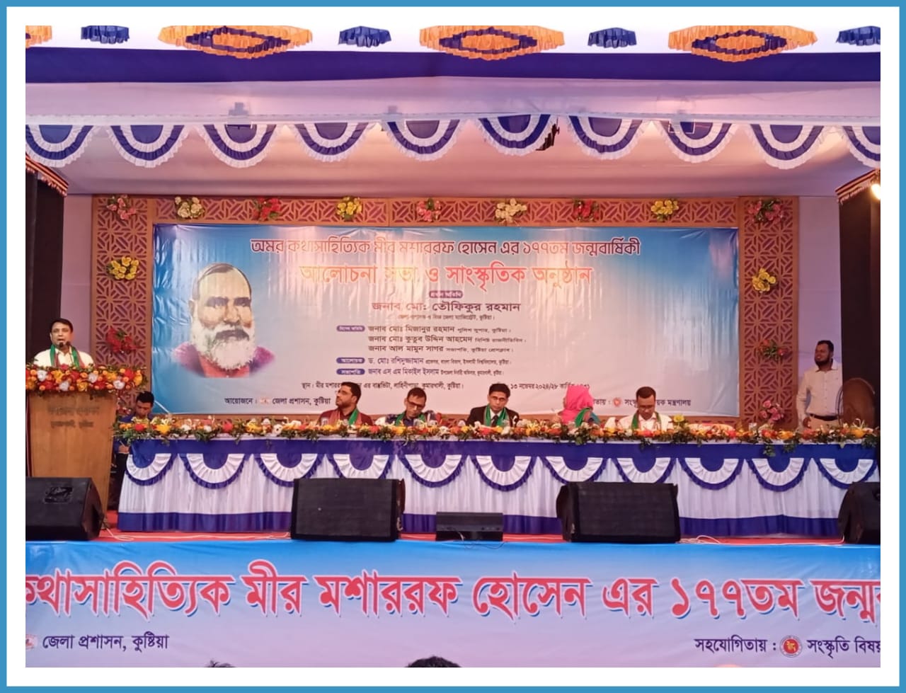 কালজয়ী উপন্যাস বিষাদ সিন্ধু রচয়িতা অমর কথা সাহিত্যিক মীর মশাররফ হোসেনের ১৭৭তম জন্মবার্ষিকী উপলক্ষে কুষ্টিয়ার কুমারখালীতে আলোচনা সভা ও সাংস্কৃতিক অনুষ্ঠানের আয়োজন করা হয়েছে।