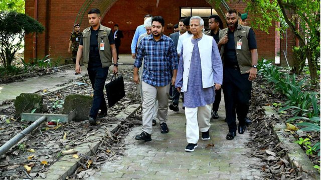 গণভবন পরিদর্শনকালে প্রধান উপদেষ্টার সঙ্গে ছিলেন উপদেষ্টা আদিলুর রহমান খান, নাহিদ ইসলাম ও আসিফ মাহমুদ।