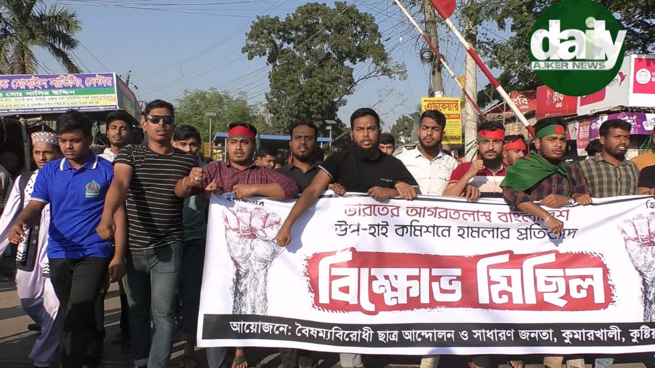 ভারতের আগরতলা বাংলাদেশ উপ-হাই কমিশনে হামলার প্রতিবাদে কুষ্টিয়ার কুমারখালীতে বিক্ষোভ মিছিল অনুষ্ঠিত হয়েছে।
