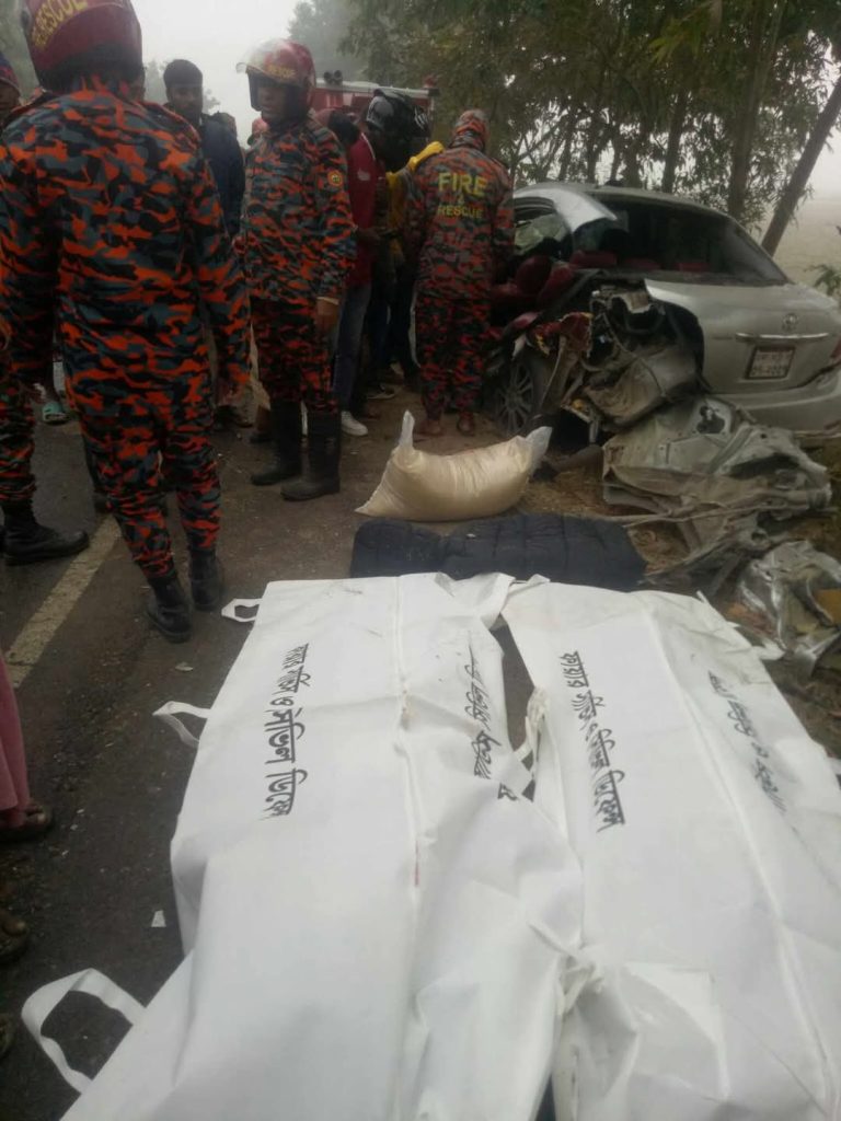 এ সময় ঘটনাস্থলে পৌঁছালে নওগাঁ থেকে রাজশাহীর দিকে যাওয়া দ্রুতগামী একটি ড্রাম ট্রাকের সঙ্গে মুখোমুখি সংঘর্ষ। তখন প্রাইভেটকারটি দুমড়ে-মুচড়ে রাস্তার পাশে পিলারে আটকে যায়। এতে ঘটনাস্থলেই প্রাইভেটকারের দুই যাত্রী নিহত হন। এ সময় প্রাইভেট কারের পিছনে থাকা একটি বাসকেও ধাক্কা দিয়ে পালিয়ে যায় ড্রাম ট্রাকটি। তবে বাসে থাকা কোনো যাত্রী হতাহত হয়নি। মান্দা থানার ভারপ্রাপ্ত কর্মকর্তা (ওসি) মনসুর রহমান এ বিষয়টি নিশ্চিত করেছেন। তিনি বলেন, খবর পেয়ে ঘটনাস্থলে গিয়ে ফায়ার সার্ভিসের সহযোগিতায় মরদেহ উদ্ধার করা হয়েছে। আইনি প্রক্রিয়া শেষে পরিবারের কাছে মরদেহ হস্তান্তর করা হবে।