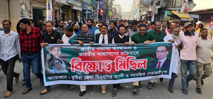 বৃহস্পতিবার দুপুরে কুষ্টিয়া জেলা বিএনপির কার্যালয়ের সামনে থেকে বিক্ষোভ মিছিলটি বের হয়ে বড়বাজার রেলগেটে সংক্ষিপ্ত সমাবেশের মাধ্যমে শেষ হয়। কুষ্টিয়া জেলা বিএনপির সাবেক সাংগঠনিক সম্পাদক এ্যাড. শামিম উল হাসান অপুর