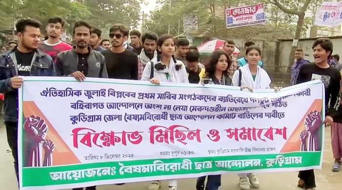 ঐতিহাসিক জুলাই বিপ্লবের প্রথম সারির সংগঠকদের বাদ দিয়ে দলছুট অনুপ্রবেশকারী বহিরাগত ও আন্দোলনে অংশ না নেয়া অছাত্রদের দিয়ে গঠিত কুড়িগ্রাম জেলা বৈষ্যমবিরোধী ছাত্র আন্দোলন কমিটি বাতিলের দাবিতে কুড়িগ্রামে বিক্ষোভ মিছিল